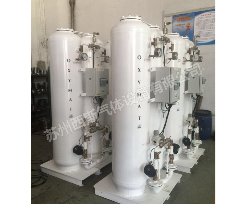 压缩空气进入吸附筒底部,床内装填沸石分子筛,该分子筛吸附大部分氮气。氧气不断地流过吸附床层在顶部富集作为产品,直至分子筛吸附氮气达到饱和。然后空气进入第二个吸附器输出氧气,同时第一个塔常压脱附排出氮气,分子筛得到再生。